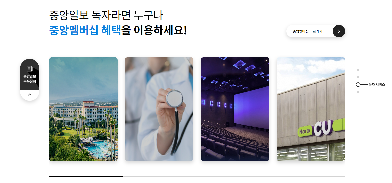 ㆍ중앙일보 구독신청 홈페이지 내 독자 서비스 메뉴(아래)에서 멤버십 혜택 이미지를 클릭하시면 자세한 정보를 확인하실 수 있습니다