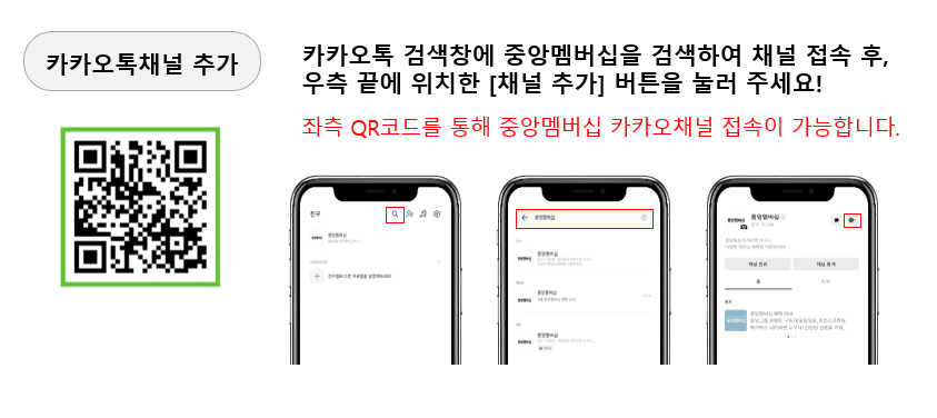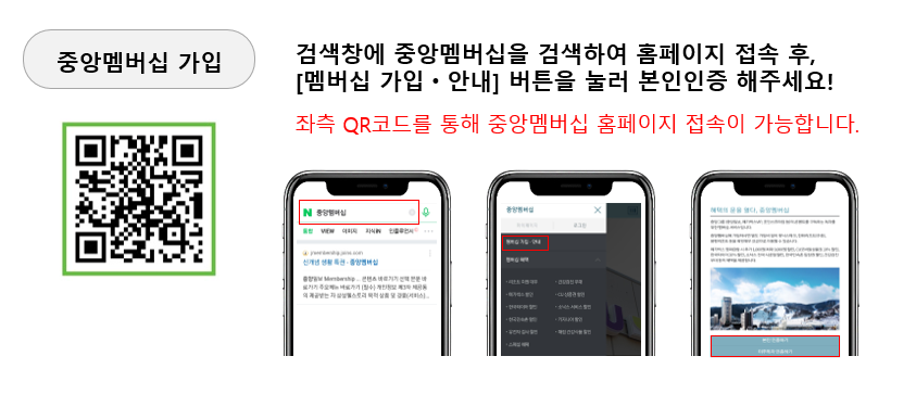 ㆍ중앙멤버십 회원 가입을 위해서는 홈페이지 QR코드(아래)를 통해 접속 후 [멤버십 가입ㆍ안내] 버튼을 눌러 본인인증 해주세요